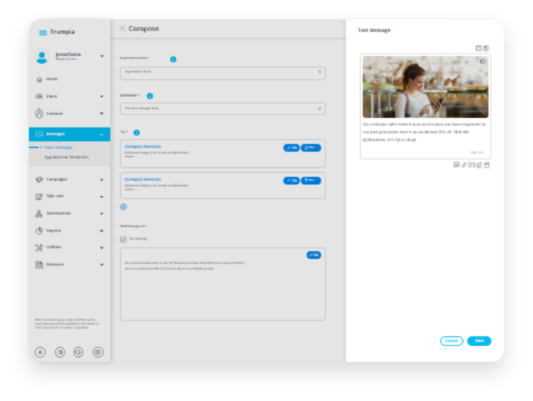Trum·pia even gives you the power of a multi-channel approach, giving you SMS, MMS, email, voice broadcasts, and Facebook posting. This means you can create coordinated efforts like sending interview tips via email, and then sending more time sensitive alerts like interview reminders via SMS.